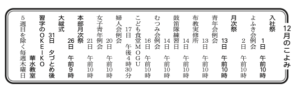 今月の大教会の予定はこちら 2025.12.01 今月の本愛大教会では以下の行事を予定しております。 詳しくは【mail@hon-ai.org】もしくはお電話にてお問い合わせください) FacebookXBlueskyCopy 【こども食堂MOGU】毎月17日午後5時から 2025.12.01 今月の大教会の予定はこちら 2024.05.01 【こども食堂MOGU】毎月17日午後5時から 2024.05.01 【ほんあいOKEIKO】書道クラスを再開しました! 2021.02.01 【おはなし会】次回の予定は未定